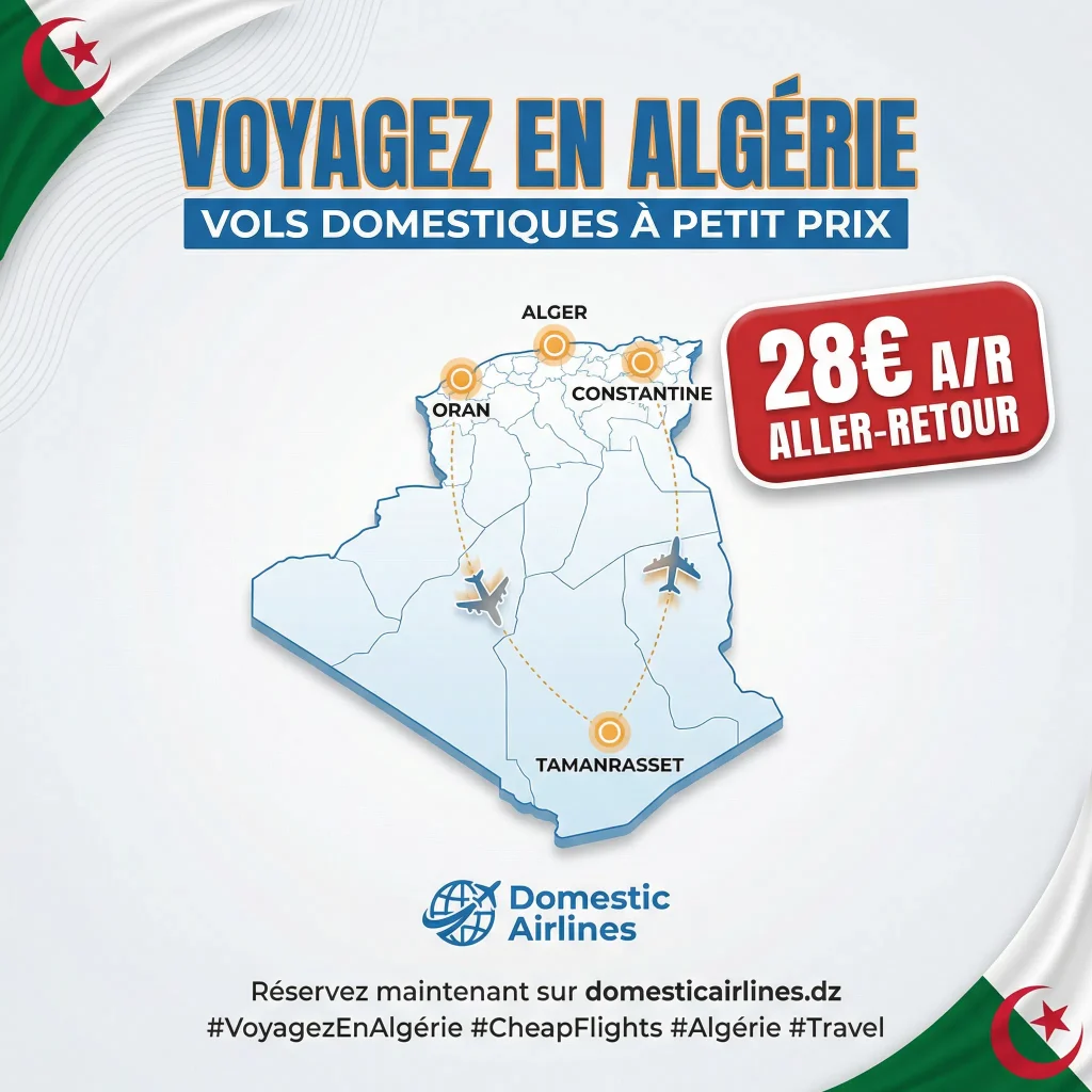 Avec 16 villes desservies, du nord au sud, et des prix d’appel comme l’aller-retour Alger-Constantine à seulement 28,80€, la compagnie rend les trésors de l’Algérie accessibles à tous. Que vous souhaitiez rendre visite à votre famille à Oran ou découvrir les merveilles de Djanet, une solution économique s’offre à vous.